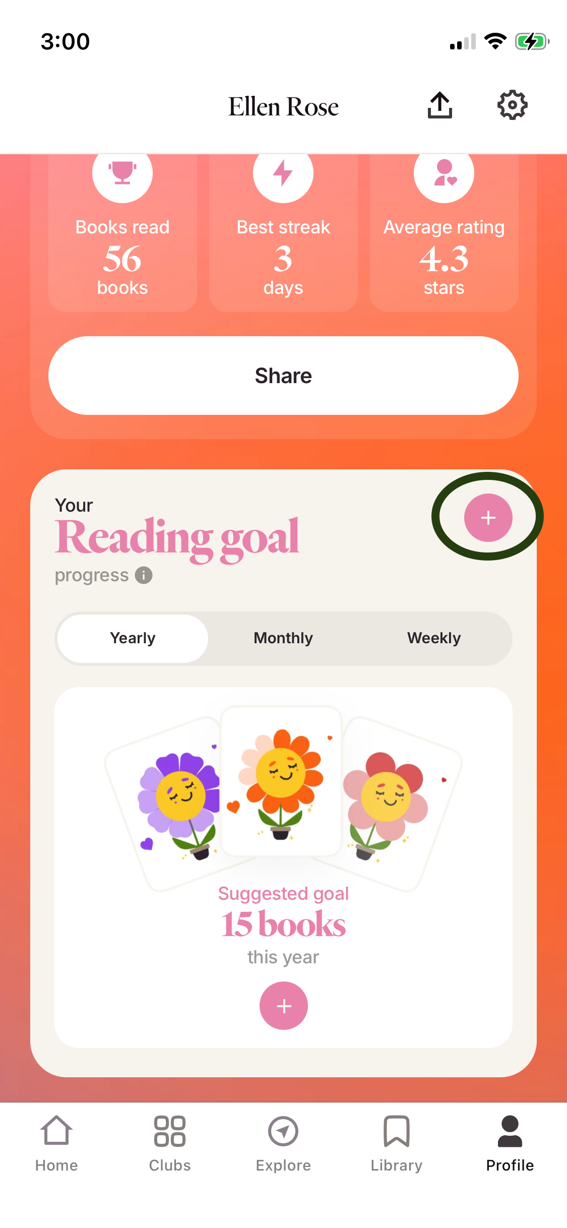To create a goal, scroll to the stats section that says 'Your Reading Goal' and click the 'icon'. That will take you to the goal creation screen. Enter your goal and select 'Save'.