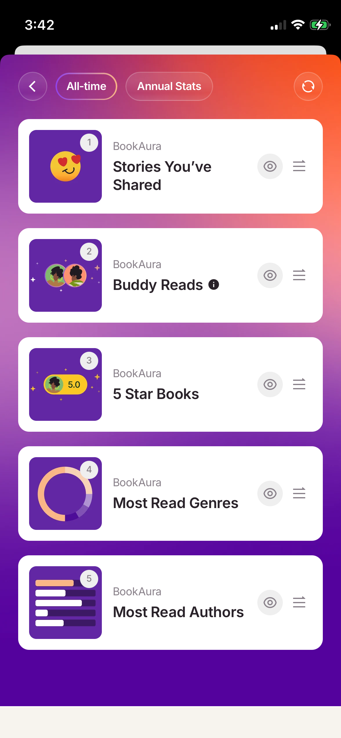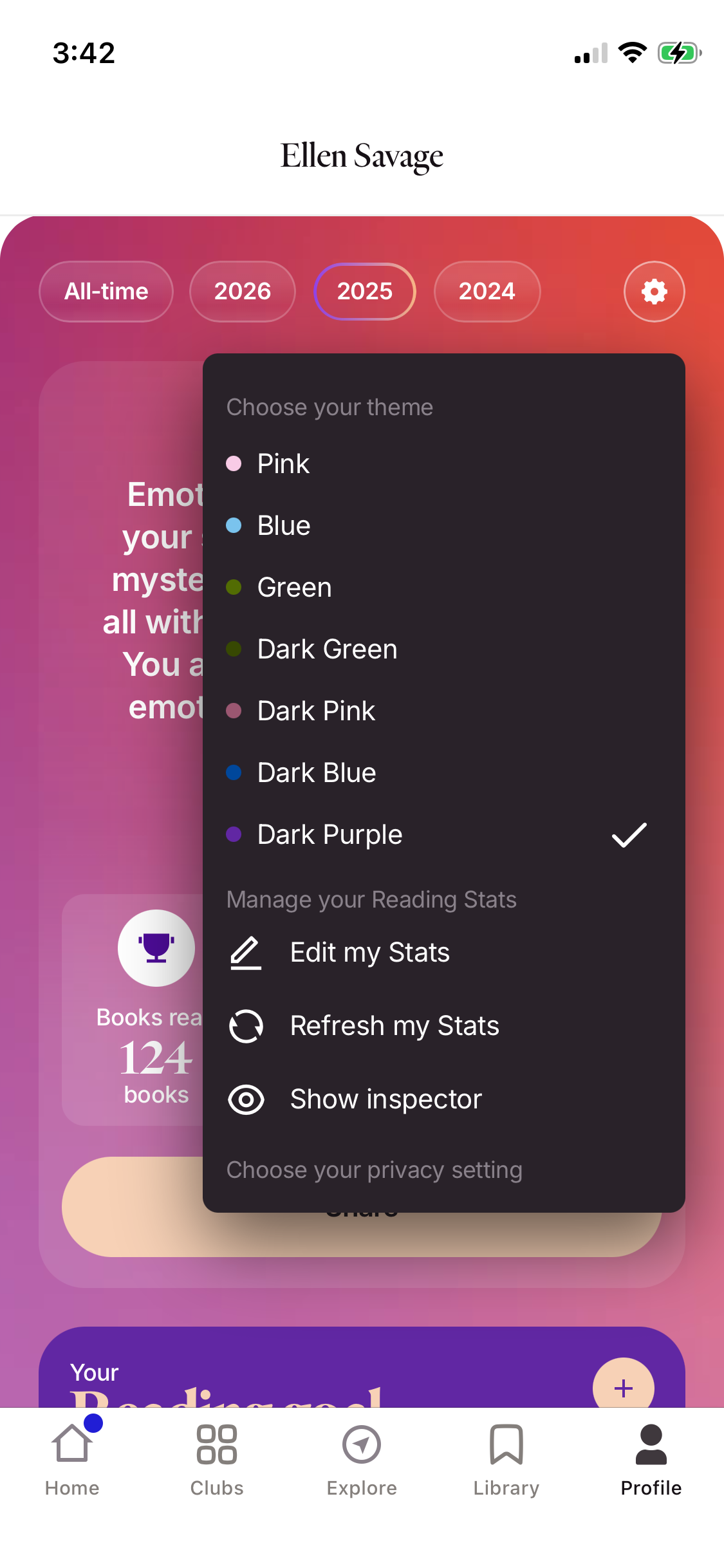 To edit your stats, select the settings icon in the top right corner of your stats. Here you can edit your theme and privacy settings, or select “Edit my Stats” to determine the order of your Stats or hide any of the Stats charts.