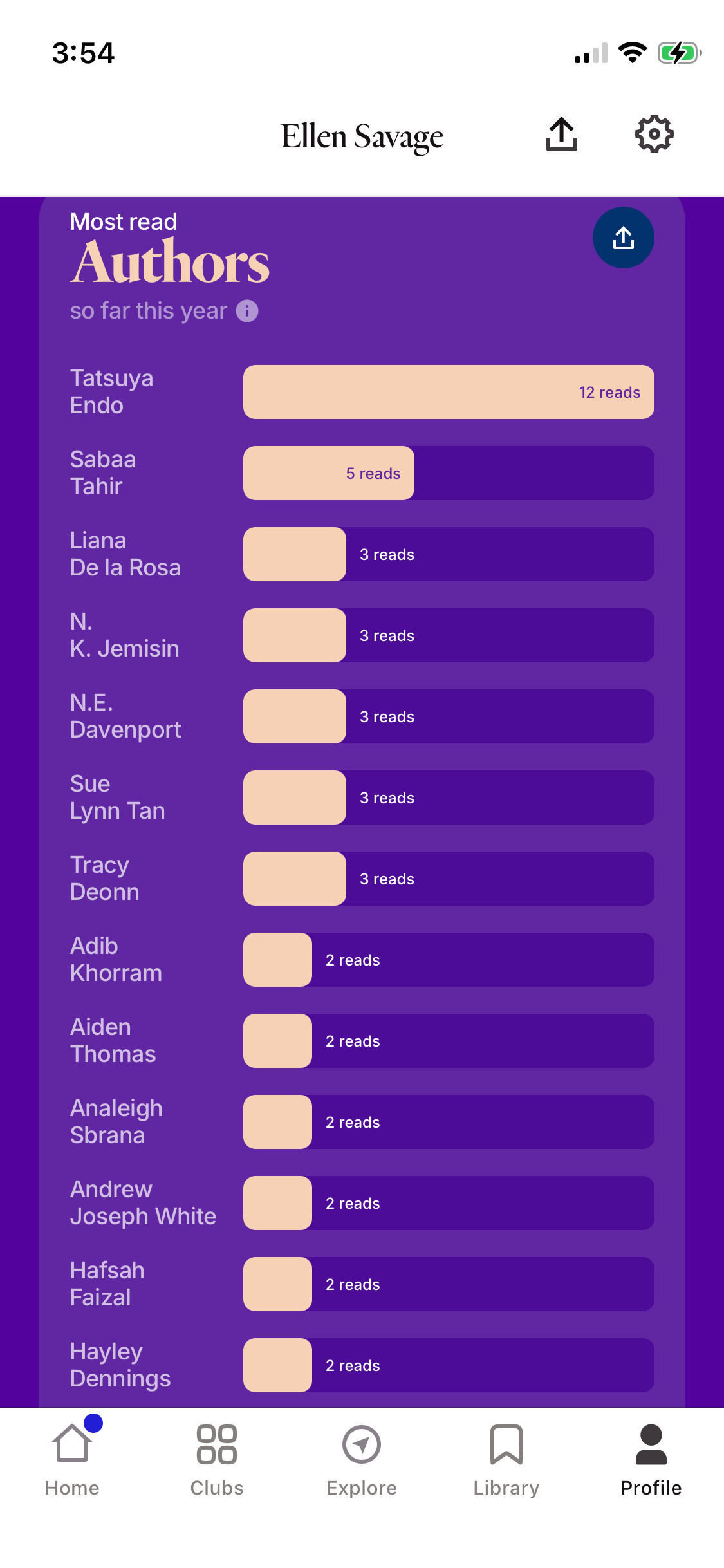 Your most read authors chat displays authors you’ve read multiple times. If viewing your yearly stats, this chat will indicate the authors you've read two or more times in a given year. If viewing your all-time stats, this will display your top 10 most read authors of all-time. Rereads are taken into consideration for this chart and books must have a finished date listed in order to be tracked in your stats.