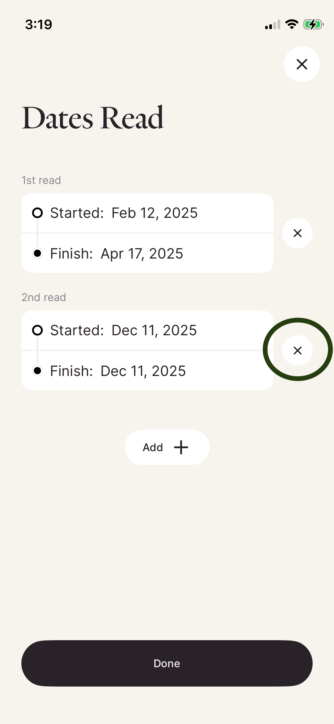 If you would like to remove a duplicated book from your stats, you'll want to remove the additional finished date associated with the book from the finished list. To do so: